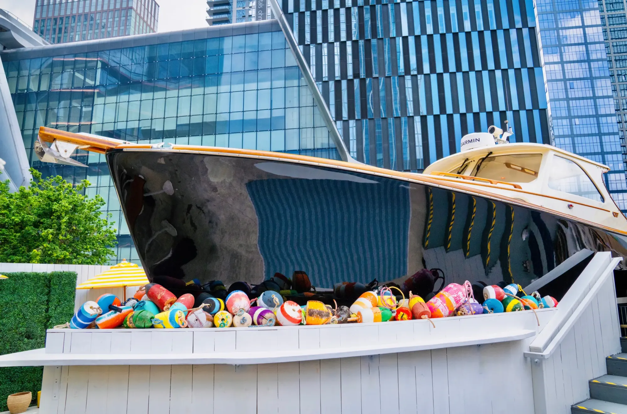A genuine vintage lobster boat repurposed into a seafood bar — oysters, martinis, and chic deck vibes, right in the heart of Hudson Yards.